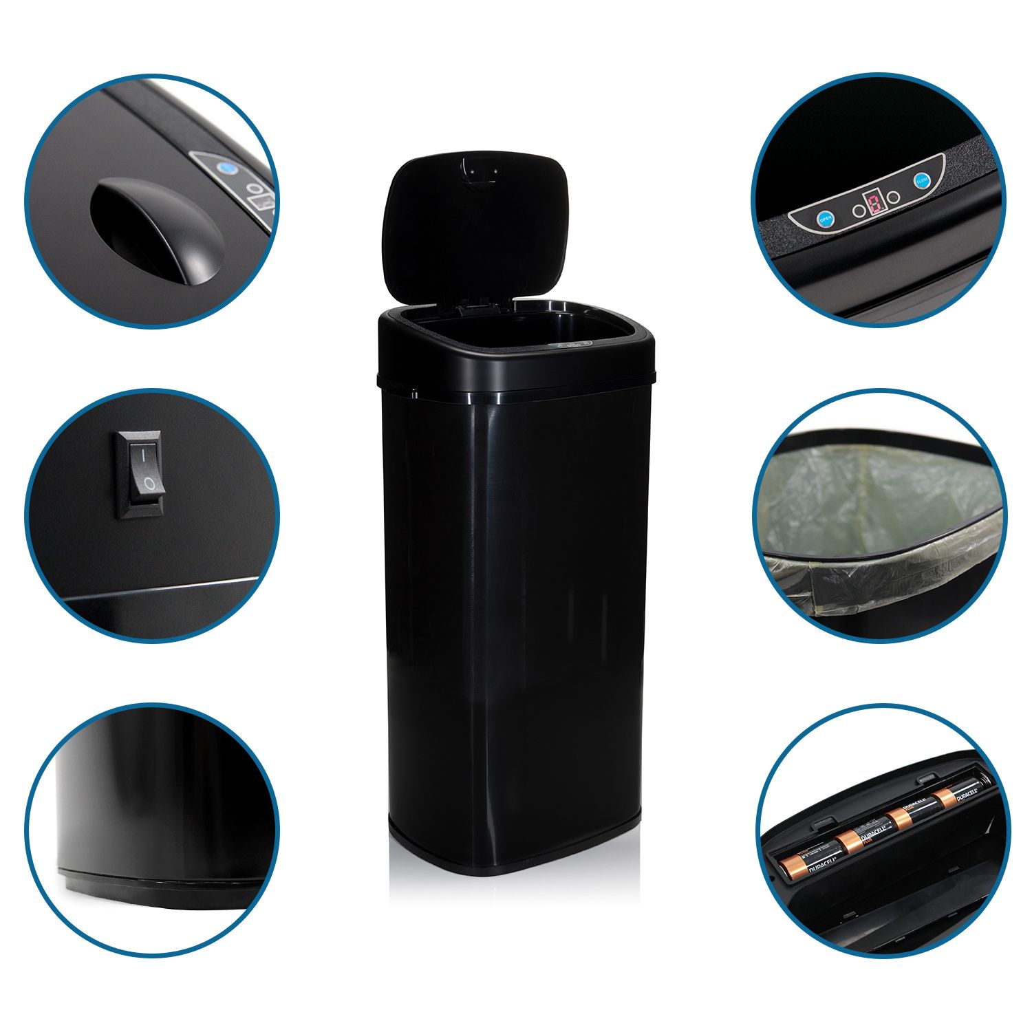 Konteinerį taip pat galima atidaryti rankiniu būdu. Prireikus naudokite atidarymo ir uždarymo mygtukus. Dangčio gale esantis įjungimo/išjungimo jungiklis leidžia išjungti jutiklį.